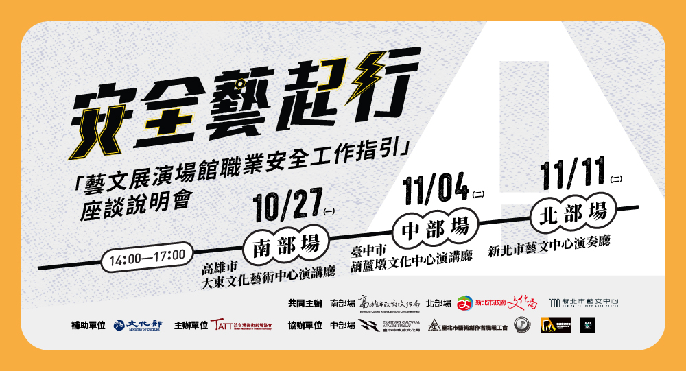 本著「健全藝文空間、從業人員職業安全意識及規範職業安全機制」之計畫宗旨,及配合文化部預計於明年度發布之「藝文展演場館職業安全工作指引」,本會受文化部補助,完成「藝文展演場館職業安全工作指引」草案之研擬,並將辦理北、中、南三場座談說明會,廣邀地方縣市政府文化局及勞動部、表演藝術團體參與,說明工作指引草案內容,同時收集從業人員針對工作指引內文之回饋意見,並共同探討日後進入藝文場館辦理相關活動時,職業安全注意事項與規範,盼逐步提升表演藝術從業環境的職業安全。