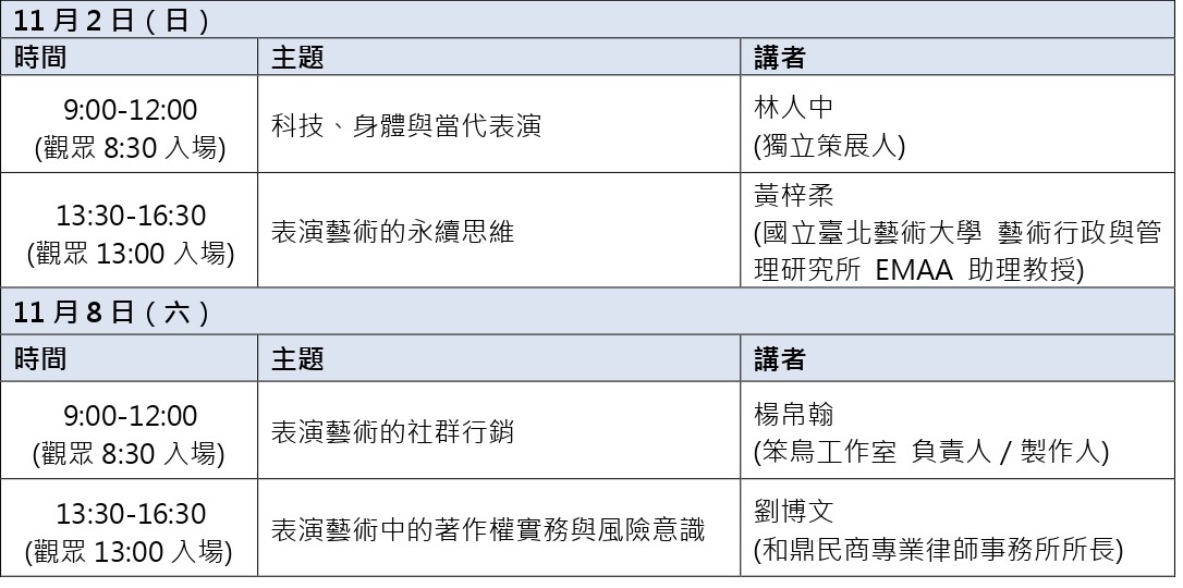 表演藝術產業在數位時代與永續發展浪潮下所面臨的新興挑戰,本課程設計四場專題講座,主題涵蓋科技與表演藝術的結合、表演藝術的永續思維、社群媒體行銷與行銷實務案例分享、以及藝術著作權等議題。每場講座將邀請表演藝術產業的資深工作者擔任講者,分享在行業內的豐富經驗和見解。同時,透過講座的交流和討論,學員將有機會與同行分享心得、解決問題,增進在地團隊系統性的劇場行政知識,促進團隊合作和發展。本課程旨在為劇場行業從業人員提供一個學習交流平台,無論是對於已在劇場行業工作的從業人員,還是對於對劇場行政管理感興趣的新人,都能藉由參與本計畫獲得實用知識、拓展視野,並提升因應未來劇場發展的整體競爭力。